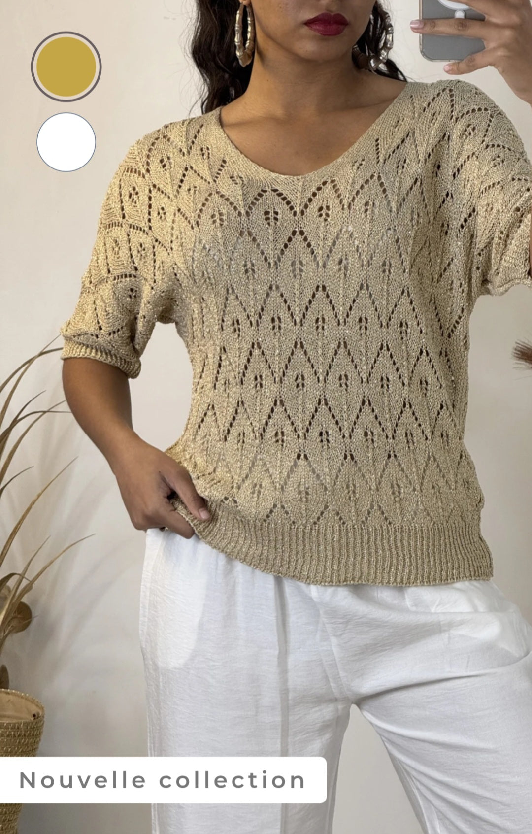 Le top doré, Top élégant en viscose et polyester, parfait pour le printemps, fabriqué en Italie -